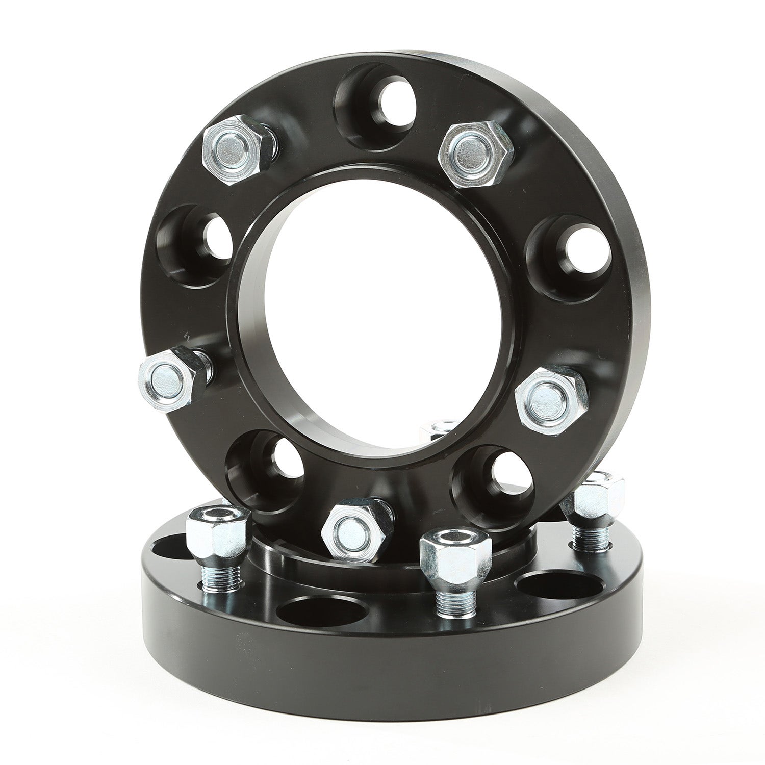 This pair of 1.25-inch thick black aluminum wheel spacers from Rugged Ridge moves your wheels out to help fit wider tires and give your Jeep a wider track and improved stability. Constructed of double anodized black extra thick 6061T6 aluminum for long life and extra corrosion resistance. All hardware is grade-8 for extra strength.