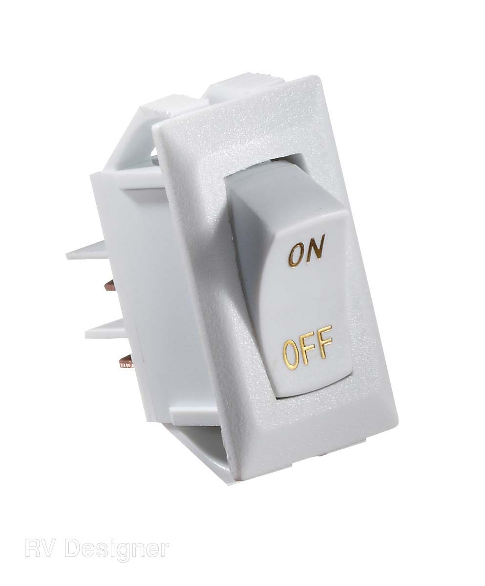 RV Designer S265, Rocker Switch, 10 Amp, On / Off, SPST, White w/ Gold Text, DC Electrical